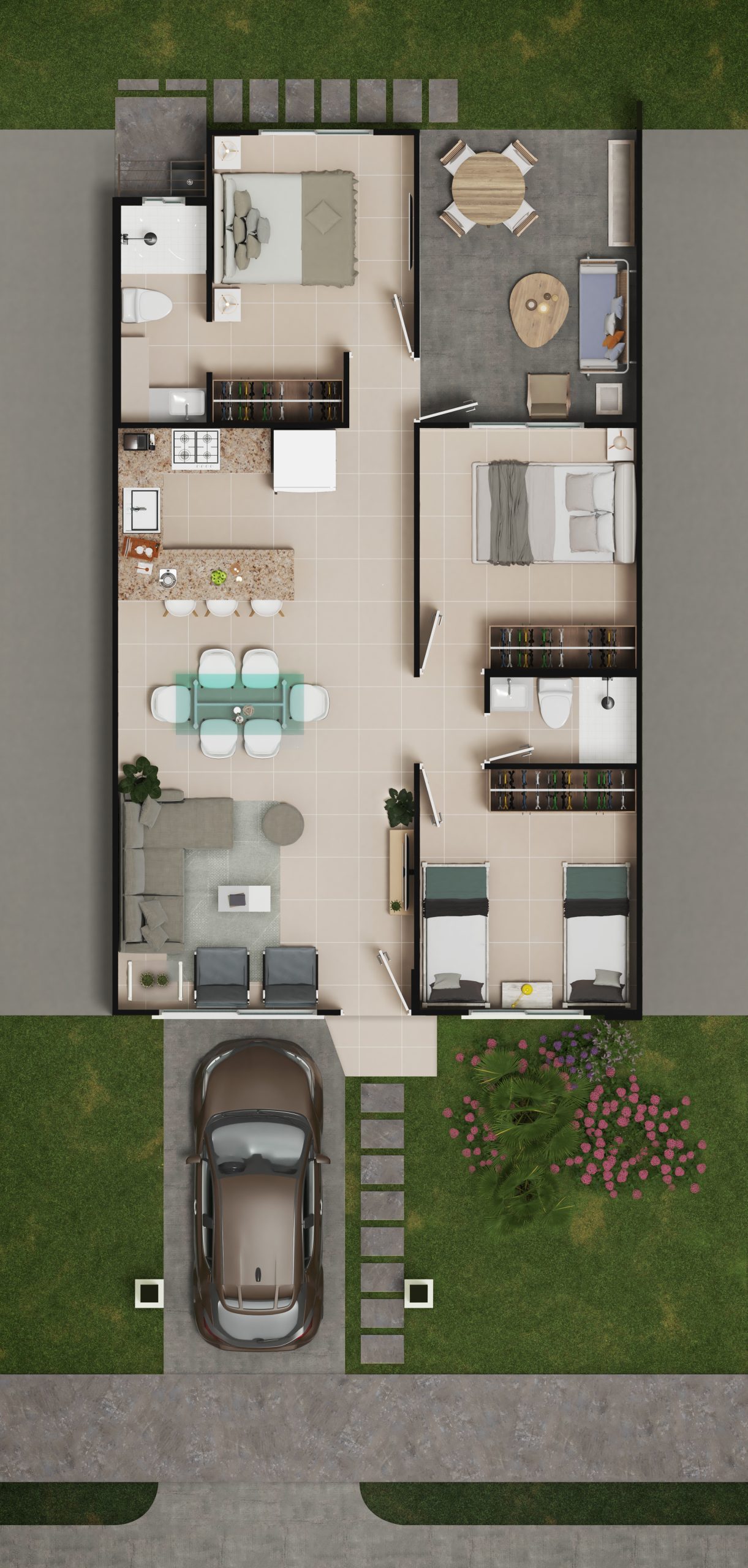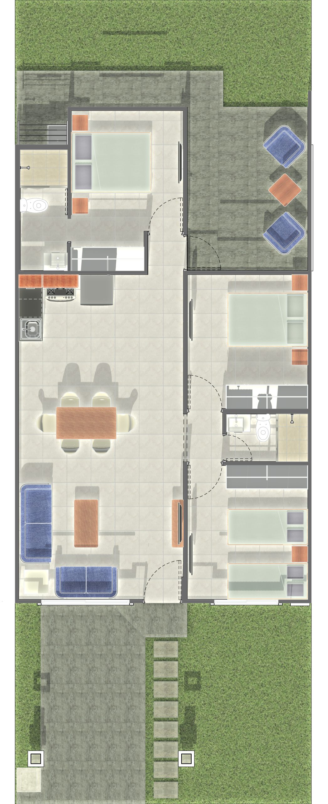 Amplia vivienda con 3 habitaciones y 2 baños. Nuestro modelo Castilla cuenta con espacios amplios como la cocina abierta con estufa y extractor; así como la zona de lavandería, terraza y mucho más.